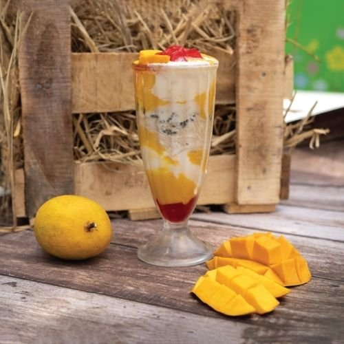 Real mango with creamy milk, Sevai, sabja and vanilla ice cream.